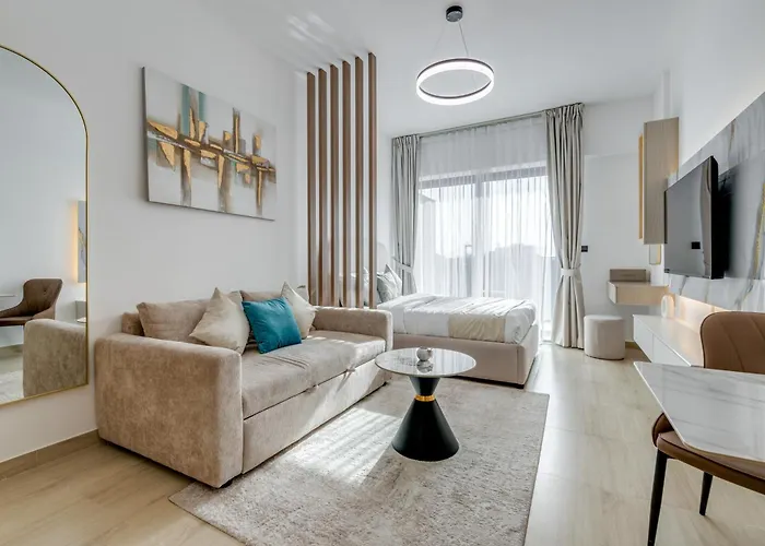 O Globalstay Stylish Apt - Pool, Gym, Free Parking - Elysee 3 Dubai de 39 m² está localizado a 4.8 km de Parque do Lago Al Barsha e a 25 minutos a pé de Cidade dos Desportos do Dubai. O Wi-Fi é fornecido para atividades empresariais e de lazer.